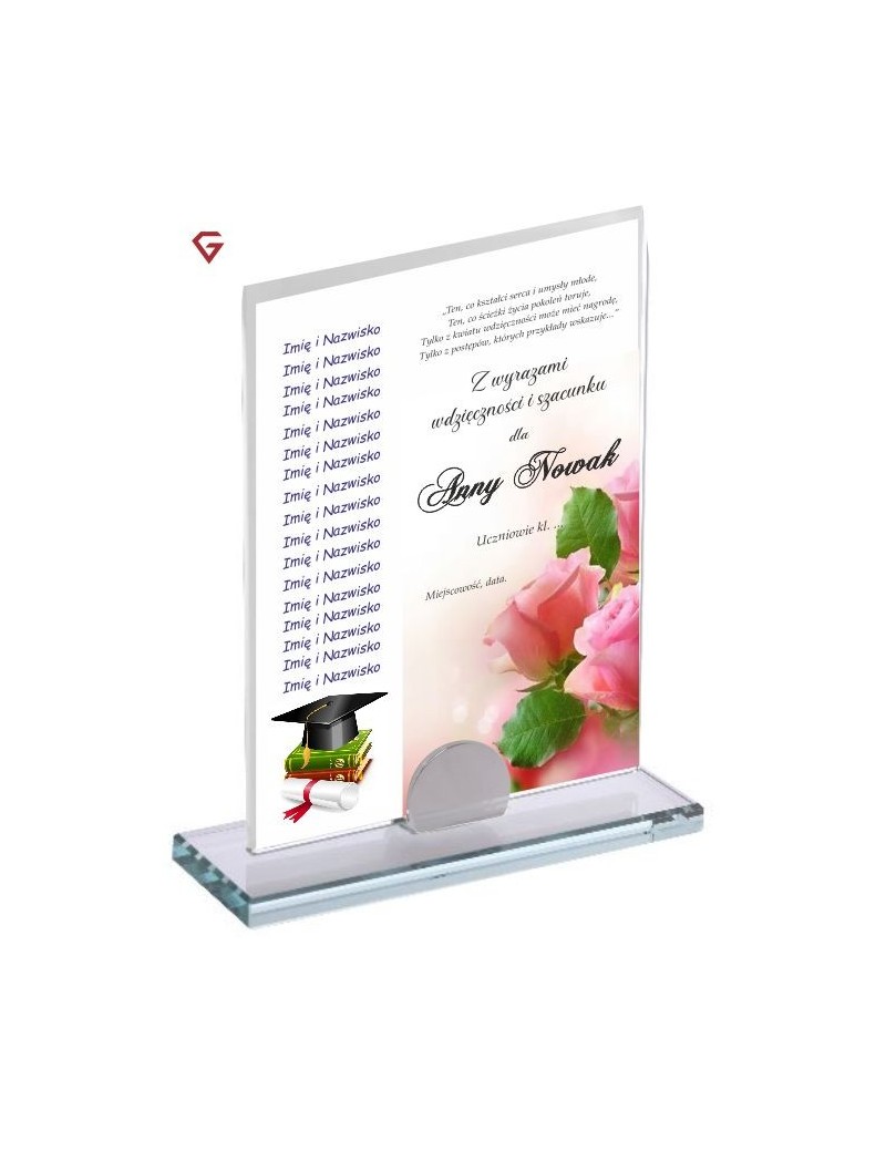 Pamiątka szklana z podziękowaniami dla nauczyciela z okazji zakończenia roku szkolnego lub dnia nauczyciela.