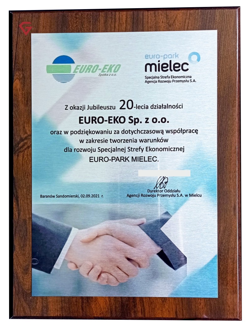 Gratulacje z okazji JUBILEUSZU DZIAŁALNOŚCI FIRMY w formie dyplomu grawerowanego.