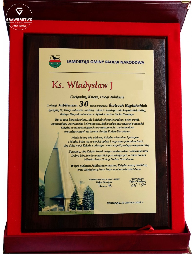 Z tej wyjątkowej okazji proponujemy wyjątkowy prezent, jakim są życzenia wykonane w formie grawertonu. Personalizowany prezent, dodatkowo ze zdjęciem kościoła parafialnego, na pewno wzruszy niejedno serce.