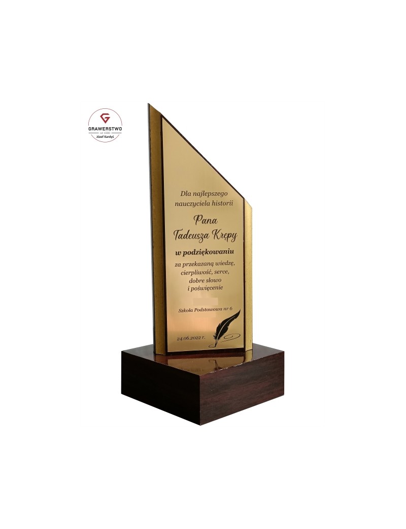 Trofeum drewniane jako podziękowanie dla nauczyciela.
