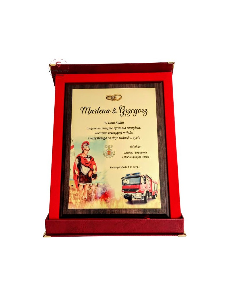 Treść pamiątki jest tylko przykładowa. Na życzenie możemy dodać tekst, zdjęcie oraz logo OSP przesłane przez Klienta.