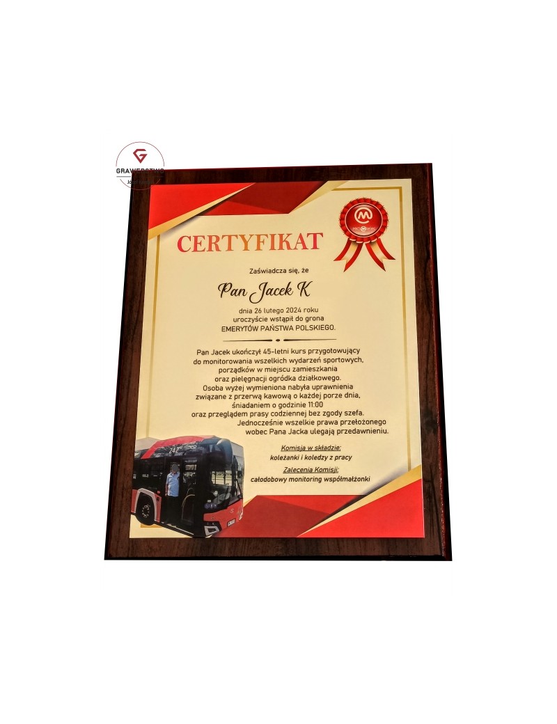 Certyfikat w formie dyplomu grawerowanego wykonanego techniką grawertonu na drewnianym podkładzie.