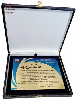 Dyplom grawerowany wykonany techniką grawertonu w eleganckim etui.