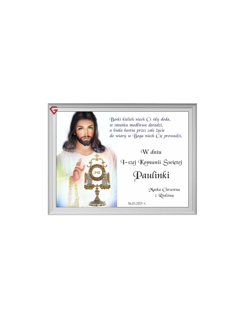 Pamiątka personalizowana z wizerunkiem Pana Jezusa z okazji I Komunii Świętej na podkładzie drewnianym.
