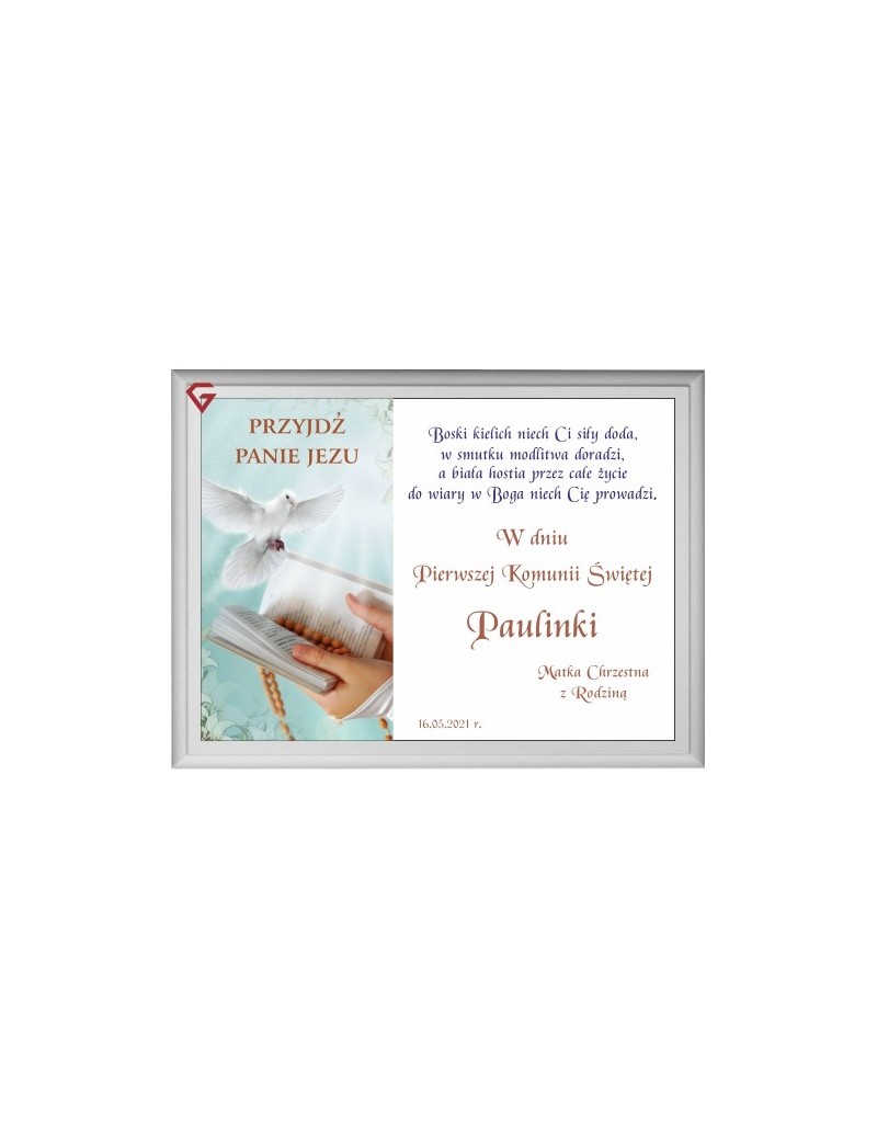 Pamiątka personalizowana z okazji I Komunii Świętej na podkładzie drewnianym.