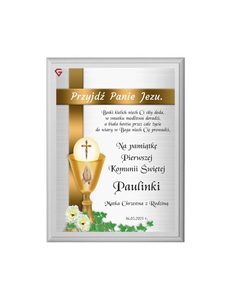 Pamiątka personalizowana z okazji I Komunii Świętej na podkładzie drewnianym.
